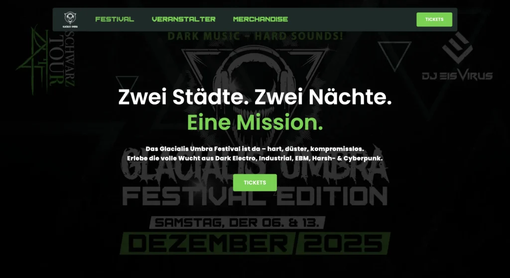 Aus einer Clubreihe wurde ein eigenständiges Festival. Für Glacialis Umbra entstand eine Website, die den Underground-Charakter des Events in eine klare, moderne Online-Präsenz übersetzt. Das Ziel war, die Atmosphäre der Veranstaltungen digital erlebbar zu machen – kühl, ästhetisch, minimalistisch – mit Fokus auf Emotion, Musik und visuelle Wirkung.