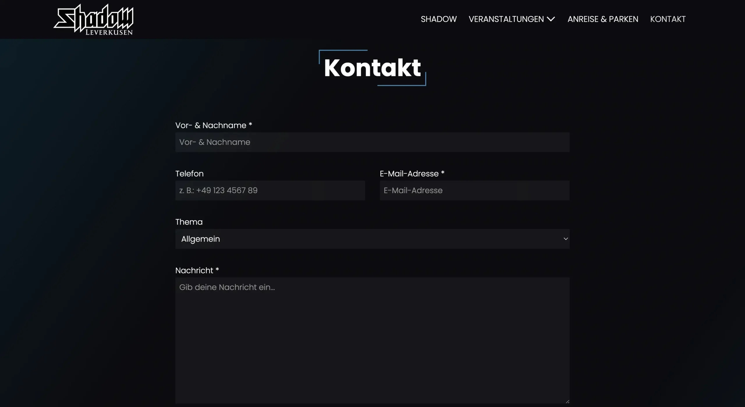 Eine moderne, dunkle Website, die die Szene-Ästhetik einfängt und gleichzeitig alle wichtigen Infos bereitstellt: Events, Dresscode, Preise, Anfahrt und Kontakt. Die Seite soll neue Besucher ansprechen, Stammgästen Orientierung bieten und gleichzeitig als digitales Aushängeschild für die Marke Shadow Leverkusen dienen.