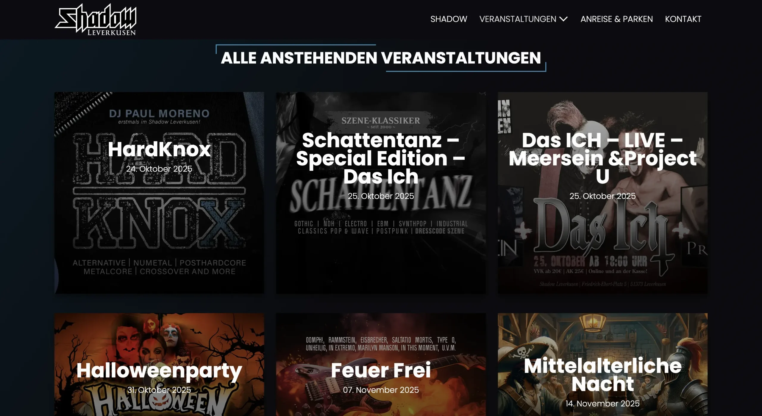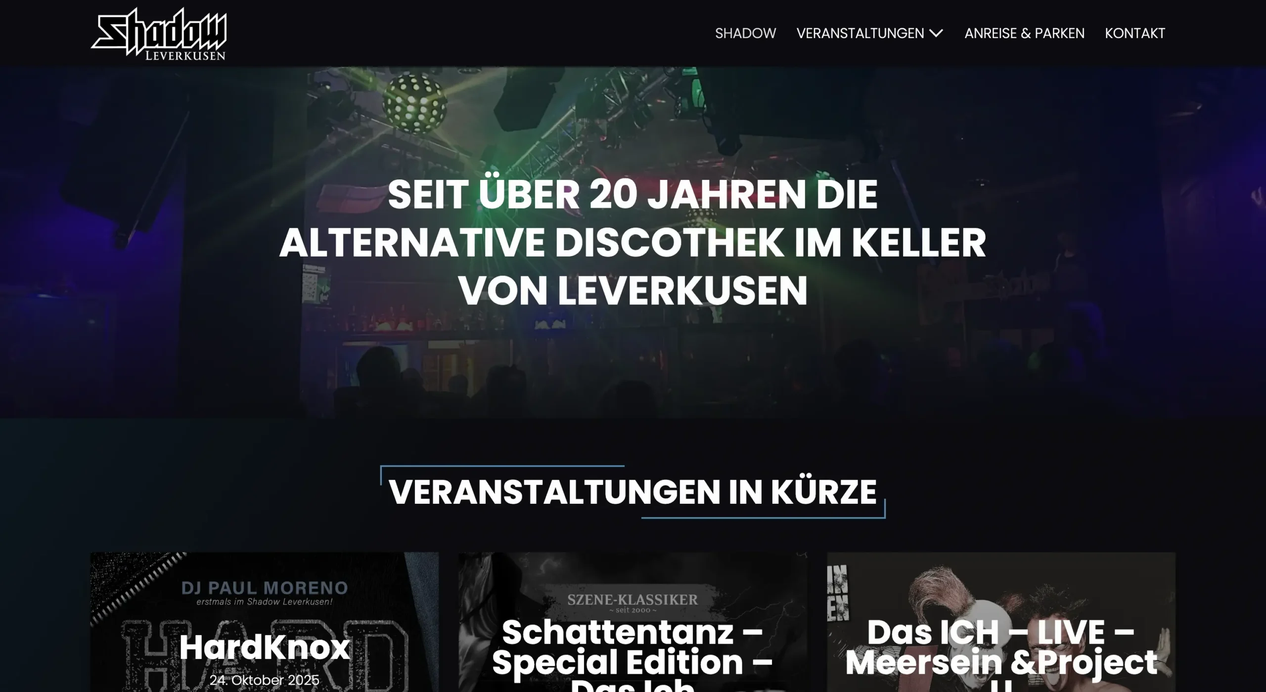 Für den traditionsreichen Club Shadow Leverkusen entstand eine neue Website, die die Atmosphäre des alternativen Szene-Clubs ins Web überträgt. Ziel war ein Auftritt, der die Clubkultur und das Lebensgefühl der Gäste widerspiegelt – dunkel, direkt und ehrlich. Der Fokus liegt auf anstehenden Events, relevanten Infos und einer klaren Nutzerführung, damit Besucher schnell finden, was sie suchen.